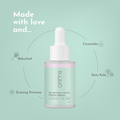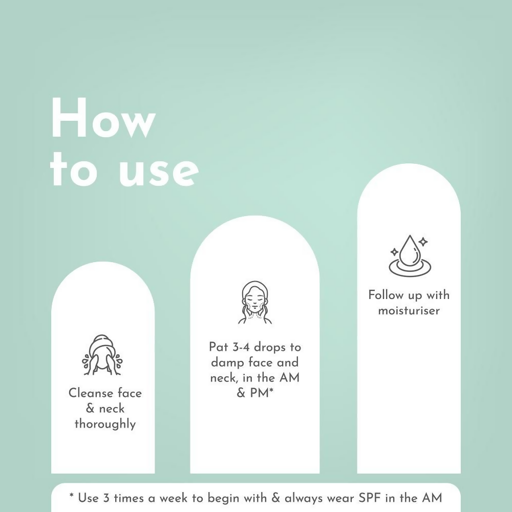 - Dispense 3-4 drops of the serum onto your palm, and gently dab across your face and neck using light tapping motions.