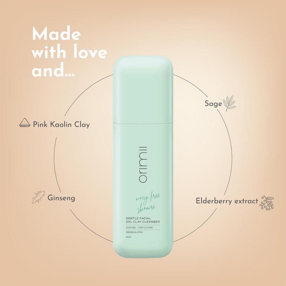 - Enriched with kaolin pink clay, this soap-free Orimii Gentle Facial Cleanser is ideal for calming overactive oil glands. It aids in minimizing perspiration and enhances circulation for a radiant complexion. This cleanser delicately treats the skin without removing essential oils and nutrients and moderates sebum production. The distinctive gel-clay concoction, enriched with kaolin pink clay, effectively extracts dirt and bacteria.