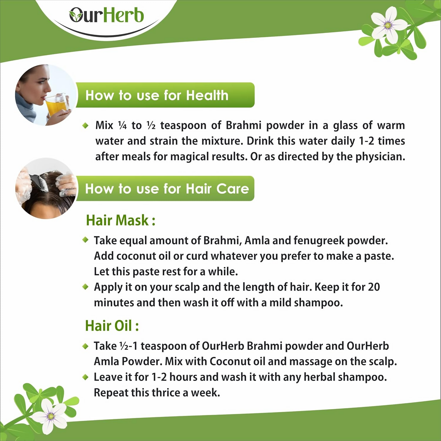 - Natural: OurHerb Brahmi Powder is crafted from premium brahmi leaves, which are meticulously washed and dried to create a pure powder. It is devoid of preservatives and chemicals.