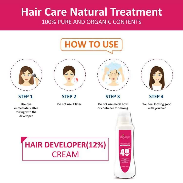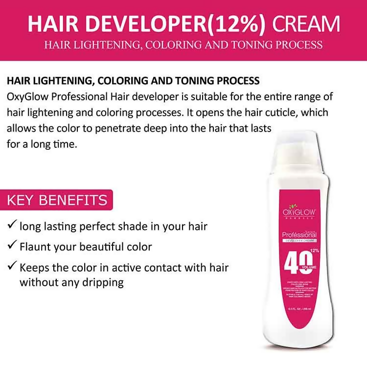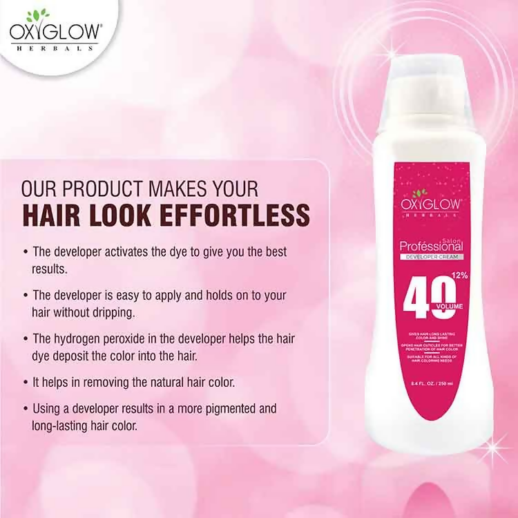About the Product:- The OxyGlow Professional Hair Developer collection is ideal for processes such as lightening, coloring, and toning hair. Its rich, creamy formulation with a non-drip consistency ensures thorough coverage of your hair, resulting in a flawless shade that endures. This indispensable product activates your hair dye, providing consistent color throughout.
