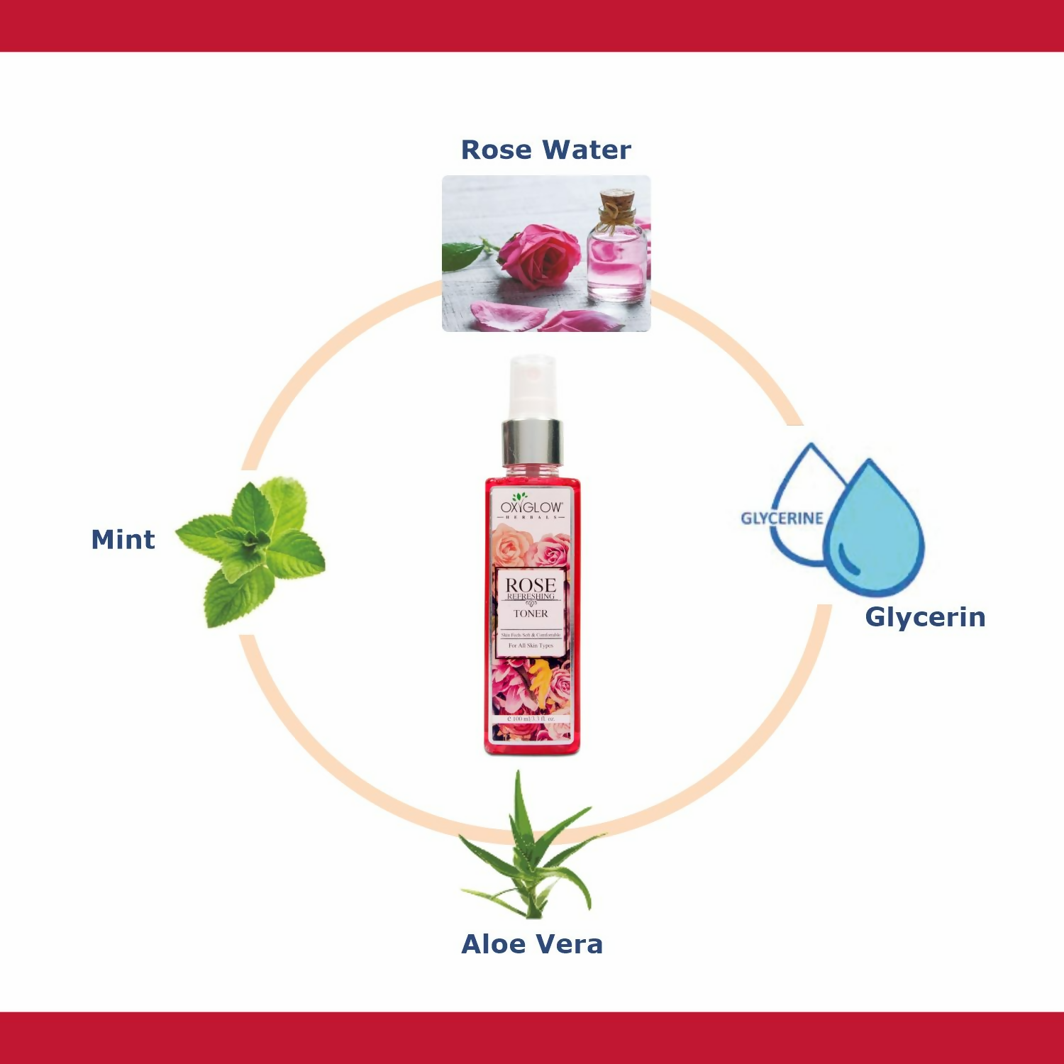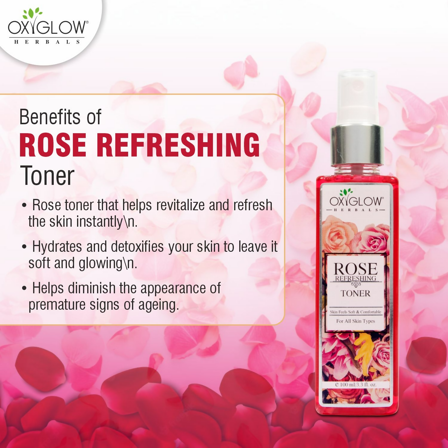 About the Product:- The OxyGlow Rose Skin Toner is infused with rose petal water, mint, glycerine, and aloe vera extracts to harmonize the skin's pH, moisturize, and rejuvenate the complexion. This toner also minimizes pores and revitalizes the skin's natural glow. It is ideal for all skin types.