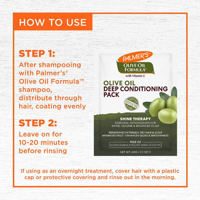 - After cleansing with Palmer's Olive Oil Formula Shine Therapy Shampoo, apply generously, working through the hair and scalp. Allow it to penetrate for 2 to 3 minutes or as preferred. Rinse thoroughly with cool water.