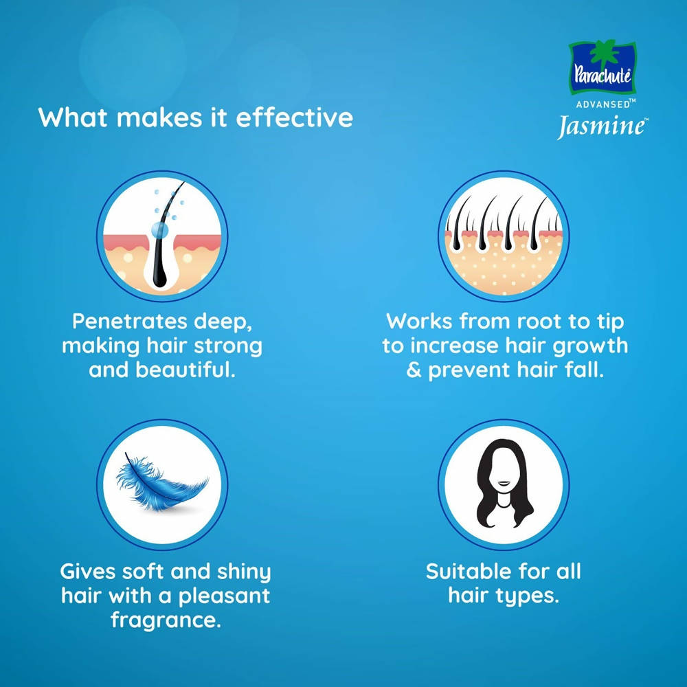 - Parachute Advansed Jasmine Hair Oil offers soft and shiny hair with a delightful aroma