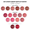 - Discover Parul Garg's Day & Night Creamy Matte Lip Crayons, thoughtfully designed to perfectly enhance Indian complexions. Infused with Vitamin E, Almond oil, Jojoba oil, and Shea Butter, these luxurious lip crayons provide hydration and nourishment while offering vivid, enduring color. With intensely pigmented shades ranging from subtle nudes to bold dramatic tones, these lightweight and non-sticky lip crayons deliver a comfortable matte finish. Effortlessly applied in a single stroke, they ensure your lips remain soft and look stunning from dawn till dusk. Please be aware: Shades might appear slightly varied in images due to differences in screens and lighting. Select your ideal shade and effortlessly enhance your look for any occasion.