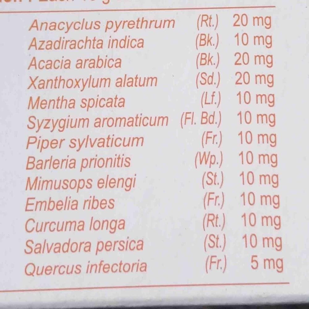 Akarkara, Neem, Babool, Pudina, Loung, Pippali, Bajranti, Vidang, Meswak, Majuphal