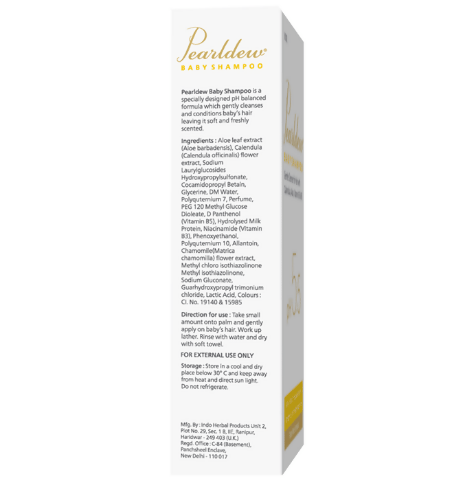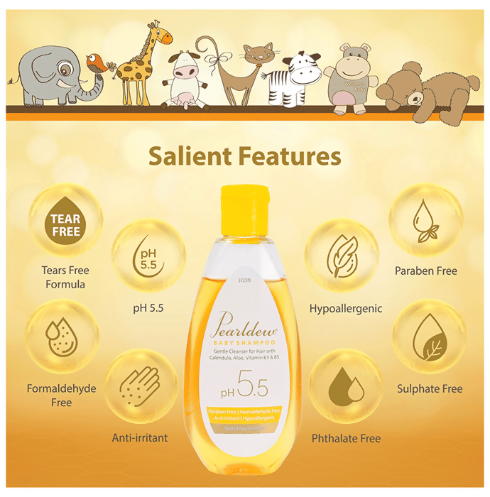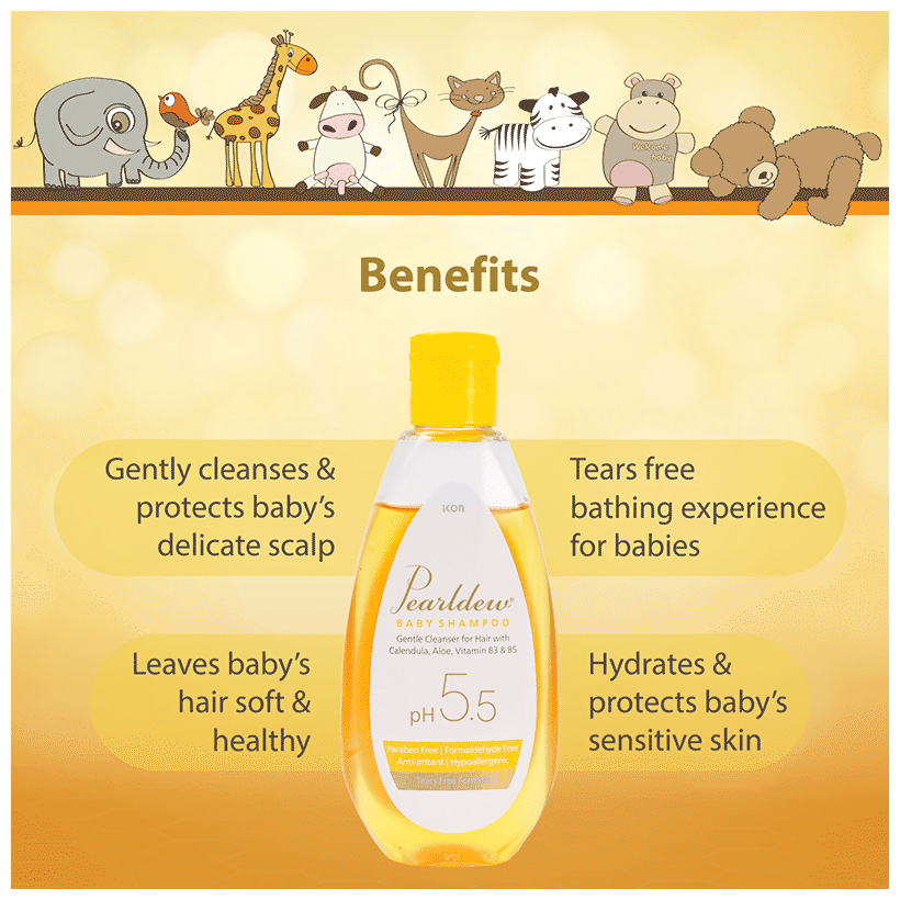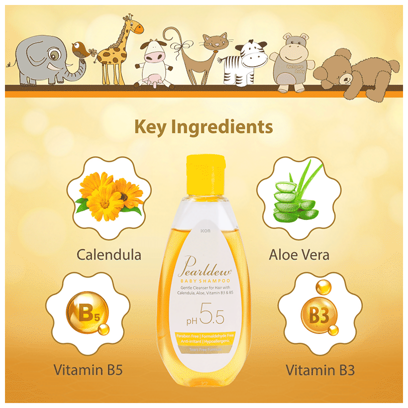 - Pearldew Baby Shampoo is designed to be anti-irritant, hypoallergenic, and free from parabens and formaldehyde. Its tear-free formula gently cleanses your baby's hair.