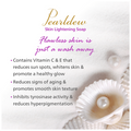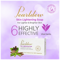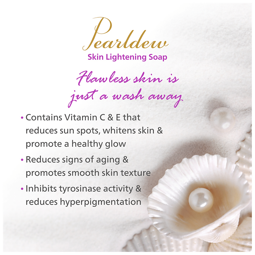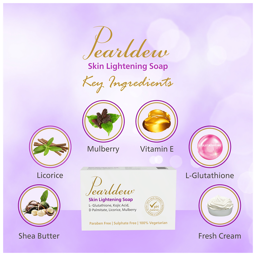 - Pearldew Skin Lightening Soap is enriched with the benefits of Glutathione, mulberry extract, liquorice extract, and shea butter. Glutathione functions by reducing the skin’s melanin production, leading to a natural illumination of the skin. It aids in diminishing hyperpigmentation, freckles, uneven skin tone, age spots, and other aging signs. The soap's antioxidant properties are known to support healthy and youthful skin by decelerating cell death and assisting in maintaining the vitality of skin cells.