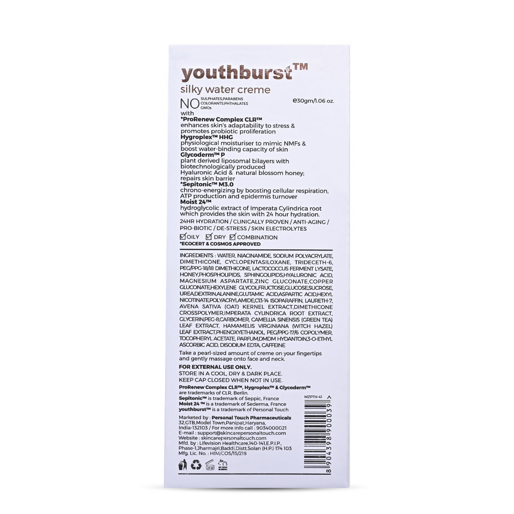 Youthburst Water-based Face Cream by Personal Touch Skincare is a lightweight, non-greasy formulation with aqua as its primary ingredient. This effective cream enhances the skin's quality, providing optimum moisture and hydration with its thin consistency. Glycerine offers moisture, while Hyaluronic acid makes the skin supple and radiant. Regular use of this water cream helps seal in moisture and replenish nutrients, benefiting all skin types, especially oily skin prone to breakouts and acne. The aqua-based formula prevents clogging of pores and reduces the chances of breakouts.