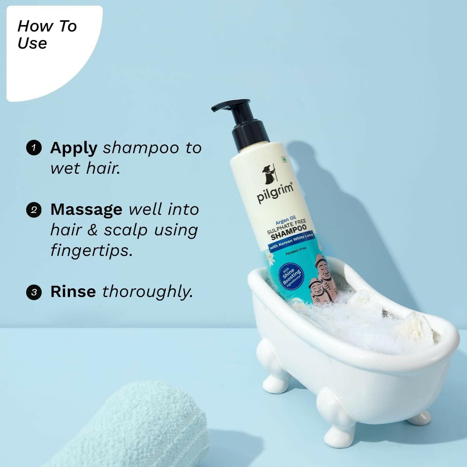 - PURE INGREDIENTS, NO HARMFUL SUBSTANCES: Crafted under the strict guidelines of THE PILGRIM CODE, this gentle shampoo is FDA-approved and free from Parabens, Sulphates, Mineral Oils, and other harsh chemicals, ensuring it is Cruelty-Free. HOW TO USE: Generously apply on wet hair. Massage thoroughly into hair and scalp using your fingertips. Rinse completely. For optimal results, use daily or every other day.