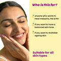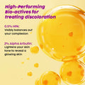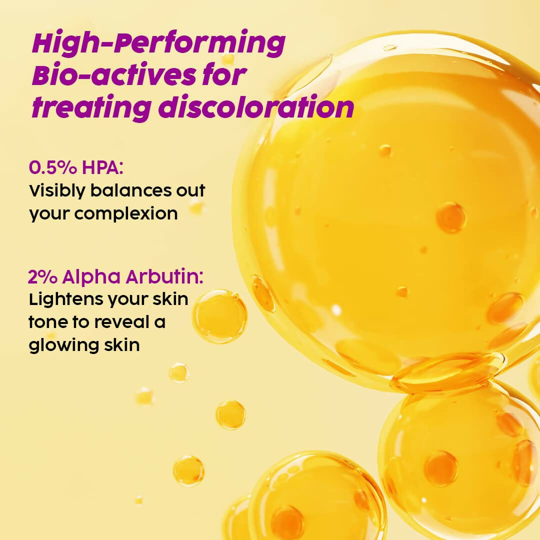 - Vibrant Skin Tone: The skin rejuvenating combination of 2% Alpha Arbutin & HPA within this serum assists in lightening discolorations & evening out your skin tone to unveil a radiant complexion.