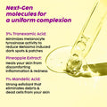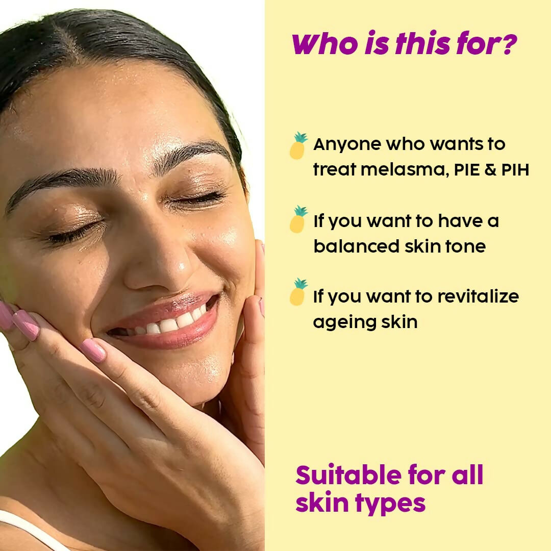 - Reduce Melasma: This fruit+active formulation includes clinically validated components such as 3% Tranexamic Acid, which aids in diminishing Melasma & hyperpigmentation, as well as PIE (Post-inflammatory Erythema).