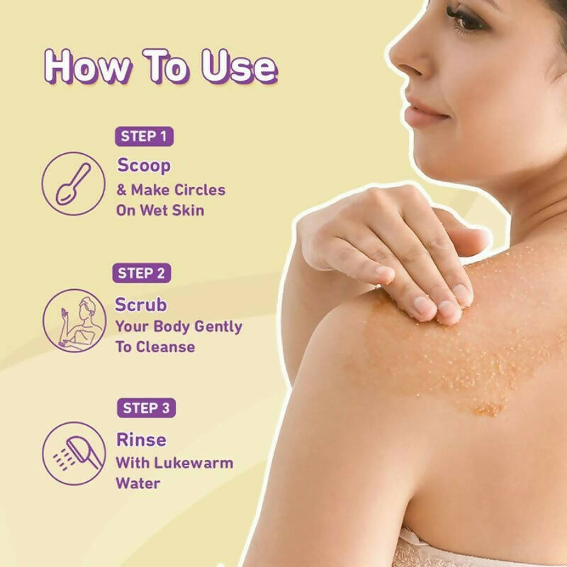 - Take a scoop and massage it in circular motions on damp skin. Enjoy the exfoliation and rinse off with warm water.
