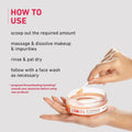 - Gently massage the balm onto dry skin with your fingertips to dissolve impurities and grime.