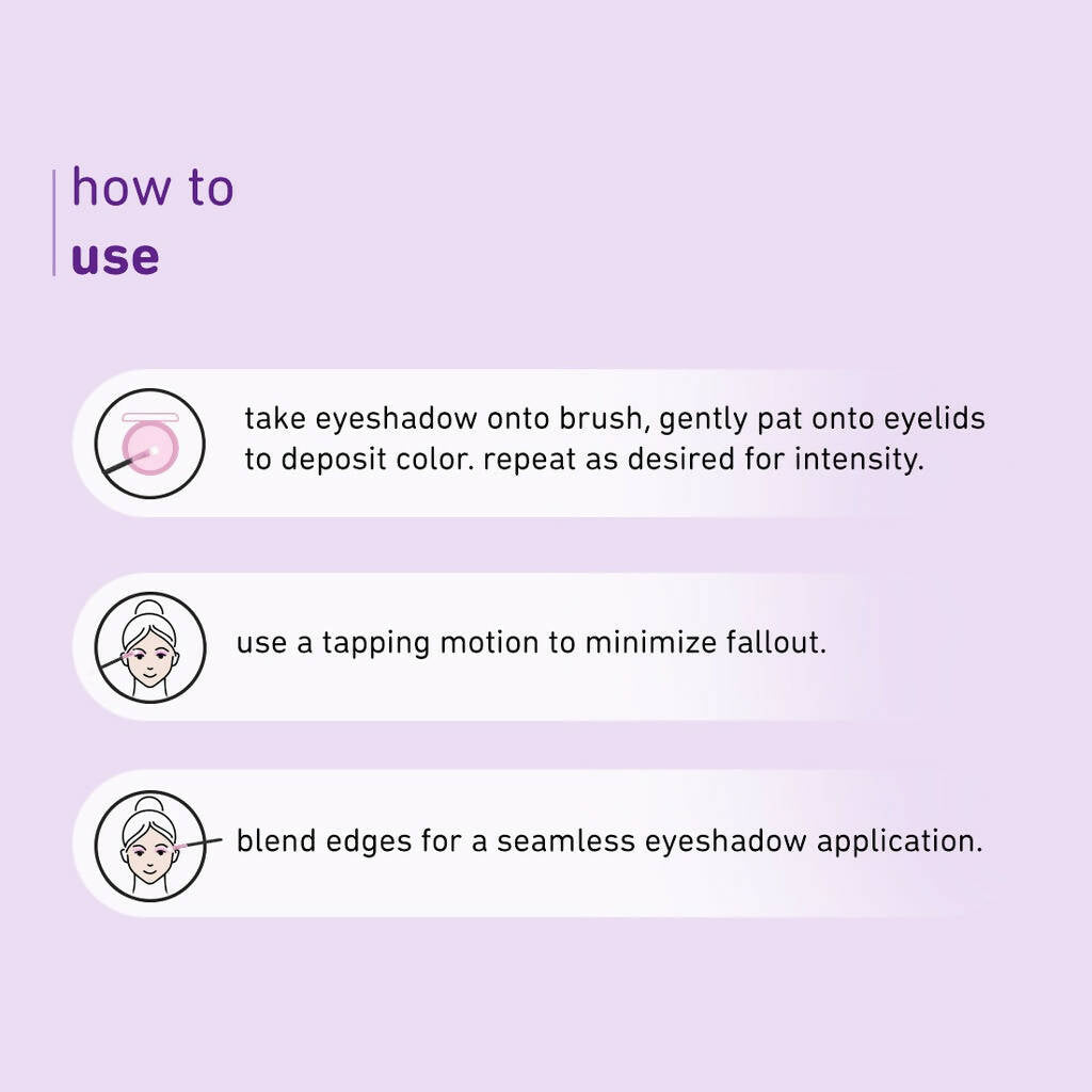 How to use:- Scoop eyeshadow with the brush, softly pat onto the eyelids to apply color. Repeat as needed for more depth.