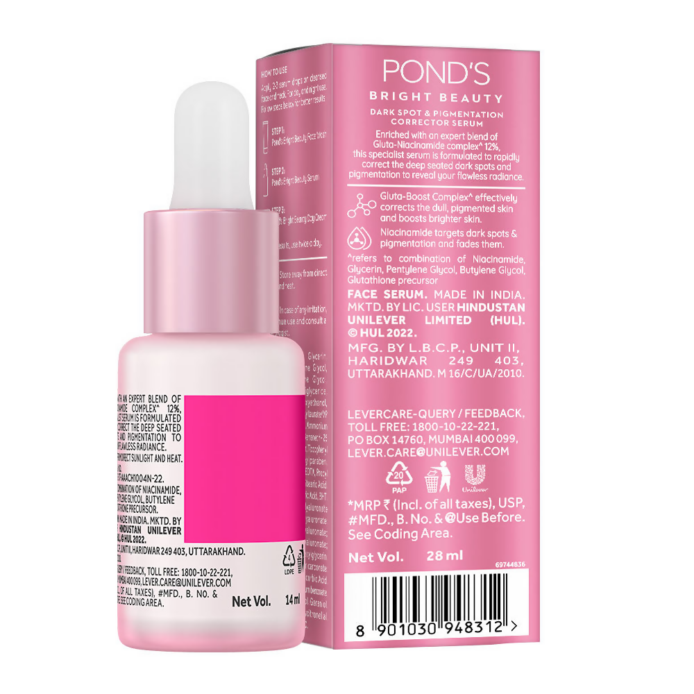 The Pond's Bright Beauty Anti-Pigmentation Serum penetrates up to 10 layers deep to rejuvenate and illuminate your complexion. This serum employs cutting-edge technology to diminish pigmentation and dark spots within two weeks, with clinical validation. Enriched with Niacinamide and glutaboost, our Pond's Bright Beauty Anti-Pigmentation serum targets entrenched hyperpigmentation, repairs skin damage, and enhances your skin's brightness from the inside out.