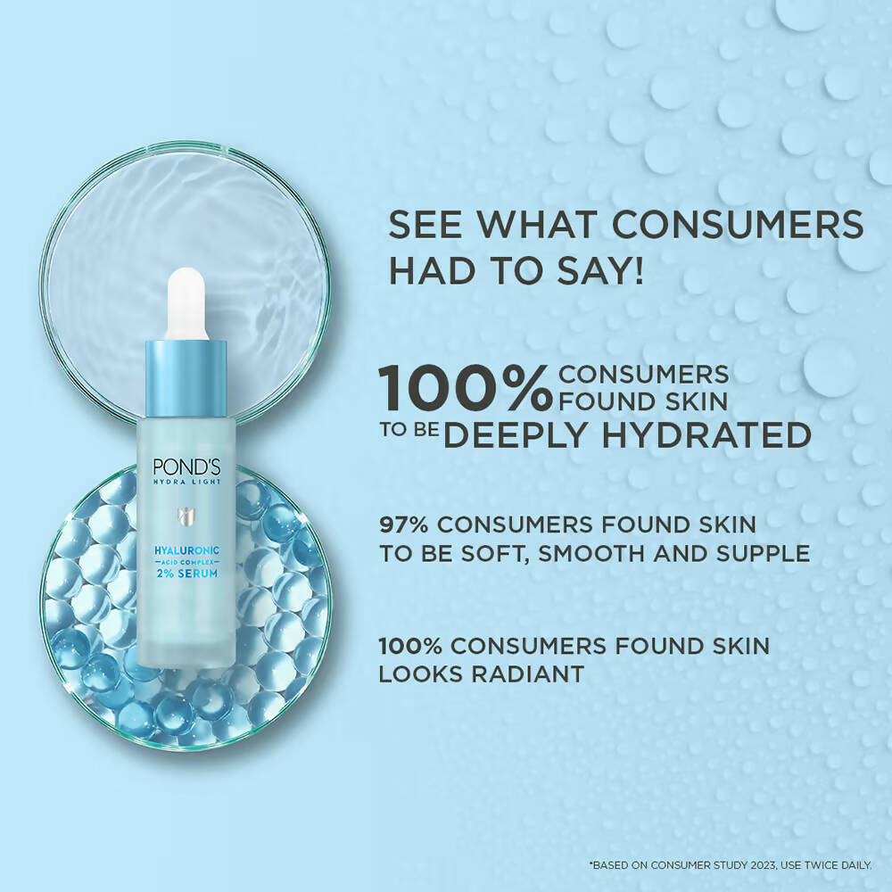 - Experience 72 hours of profound hydration with the innovative POND'S Hydra Light Serum. Crafted with a 2% Hyaluronic acid complex, this deeply moisturizing serum features micro hyaluronic acid molecules that replenish moisture in the skin’s deepest layers, providing an immediate plumping effect. Instantly enhance skin plumpness by +40%! (based on hydration Clinical study 2023). It is as light as an essence, yet offers deep hydration.
