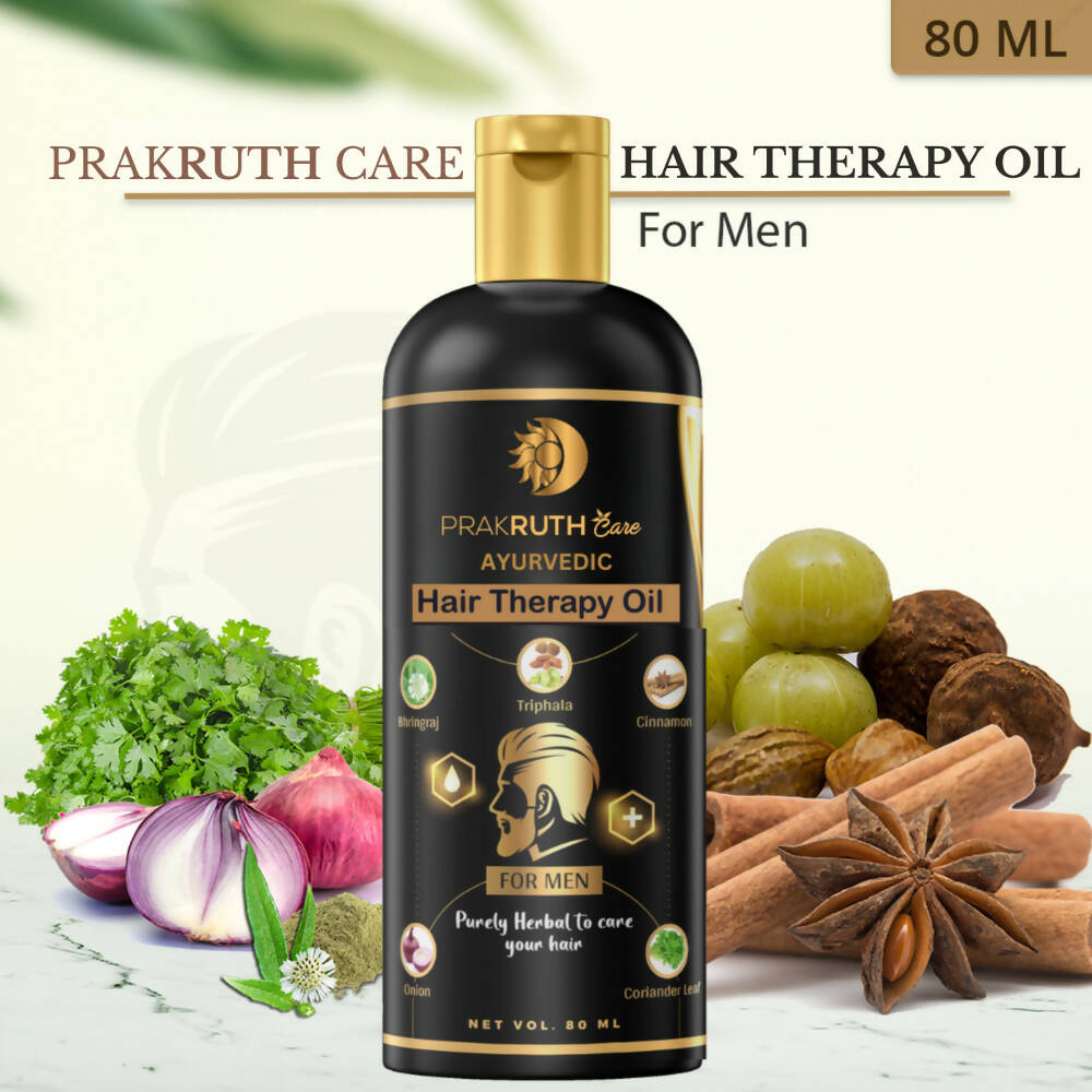 About the Product:Prakruth Care Hair Therapy Oil is meticulously crafted with a blend of over 10 herbs such as Bhringaraj, Triphala, Onion, Cinnamon, Kalonji, Rosemary, and Parijath, which are gradually infused into virgin coconut oil following Ayurvedic principles to tackle hair and scalp concerns. Suitable for: Men aged 8 and above.
