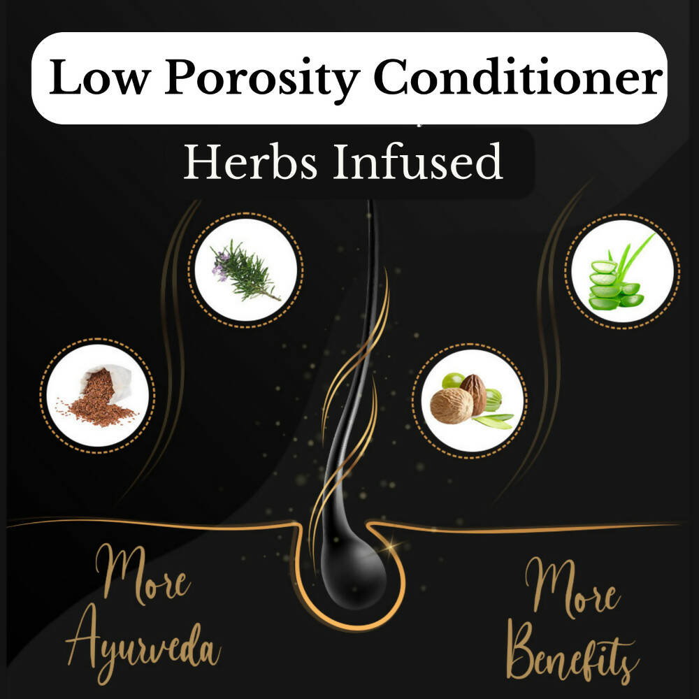 About the Product:Our Premium Herbal Low Porosity Conditioner is infused with Avocado oil, Flaxseed, Rosemary, and Vitamin C to effectively condition hair with tightly closed cuticles and lackluster appearance. This water-based formula allows for deeper and quicker absorption; it nourishes and hydrates your hair while being rich in omega-3 for enhanced strength. It provides a protective layer over cuticles, contains proteolytic enzymes to mend damaged hair, and revitalizes hair follicles to restore a lustrous shine.