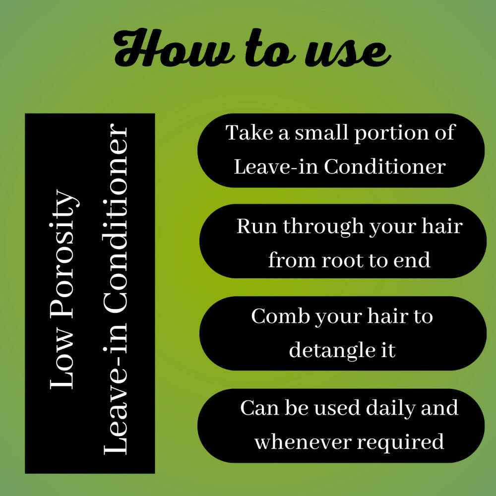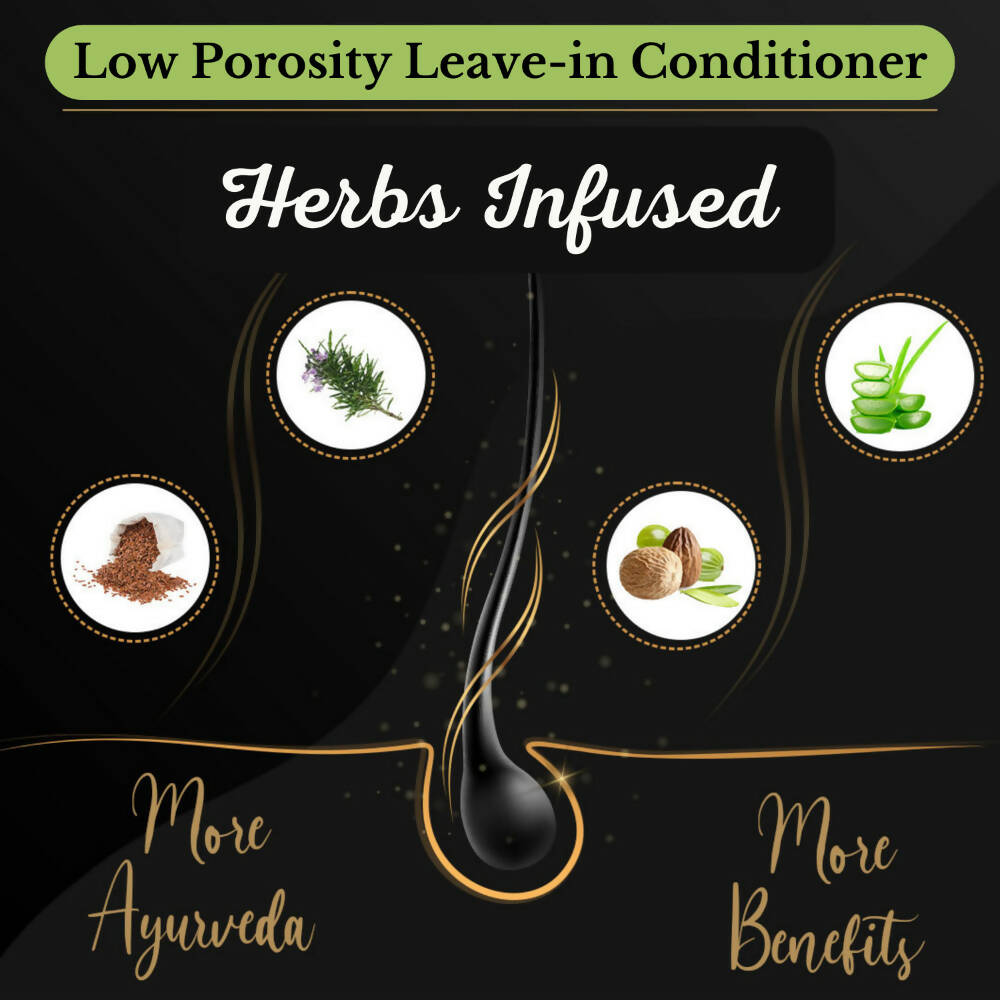 About the Product:Our Premium Herbal Low Porosity Leave-in Conditioner is formulated with Flaxseed, Aloevera, Bhringaraj, Rosemary, Vitamin C, Vitamin E, and D-Panthenol to effectively nourish tightly closed cuticles and lackluster hair in your daily care routine. It locks in moisture and hydrates hair; facilitates detangling and minimizes frizz; forms a protective barrier to prevent damage; mitigates static issues; supports cuticle bonding and infuses essential fatty acids. Enhances strength and minimizes hair breakage.