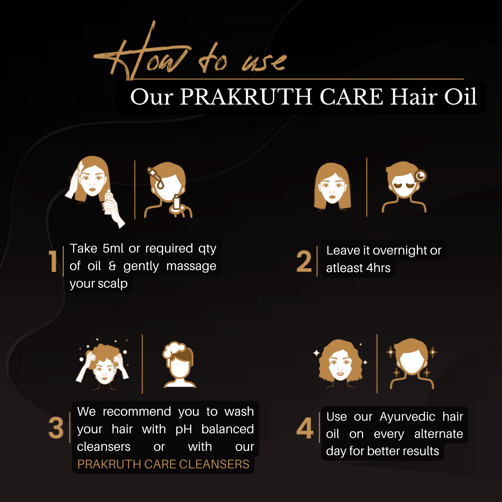 About the Product:Prakruth Care Hair Growth Oil is a potent blend of over 10 herbs such as Bhringaraj, Amla, Ashwagandha, Shatakratulata, Kalonji, and Rosemary, carefully infused into virgin coconut oil following traditional Ayurvedic methods to tackle hair and scalp issues. Ideal for individuals of all ages and genders above 8 years.