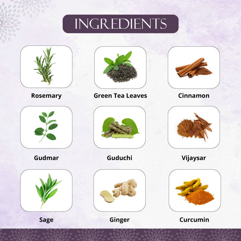 Preserva Wellness Curcumin Tea contains a blend of natural ingredients including Curcumin extract (95%), rosemary, green tea leaves, cinnamon bark powder, Gudmar, Guduchi, Vijaysar, sage, and ginger. This herbal tea is crafted with carefully selected botanicals to provide a flavorful and aromatic tea experience.