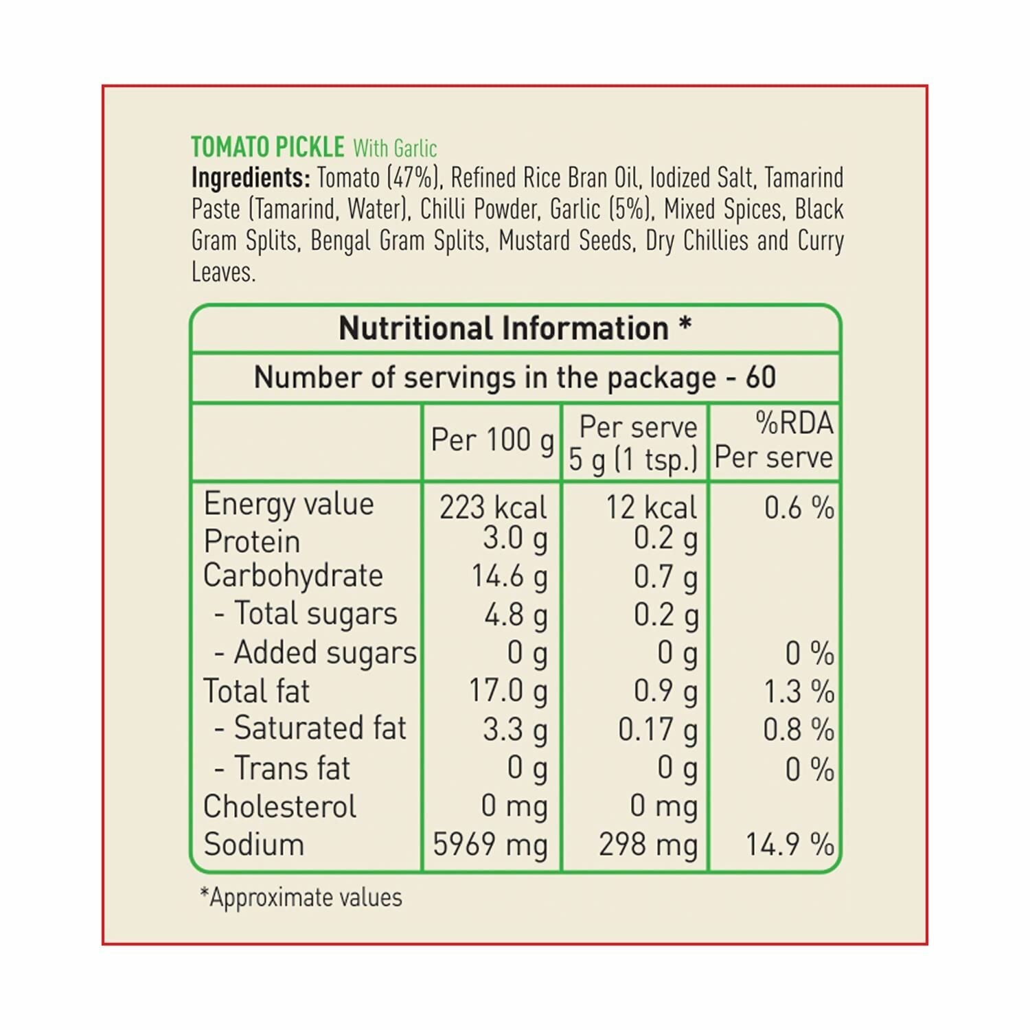 - Authentic and signature pickle flavor - Priya tomato pickle with garlic is an irresistibly enticing and cherished condiment. It is beloved across generations - a unique taste that lingers in memory!