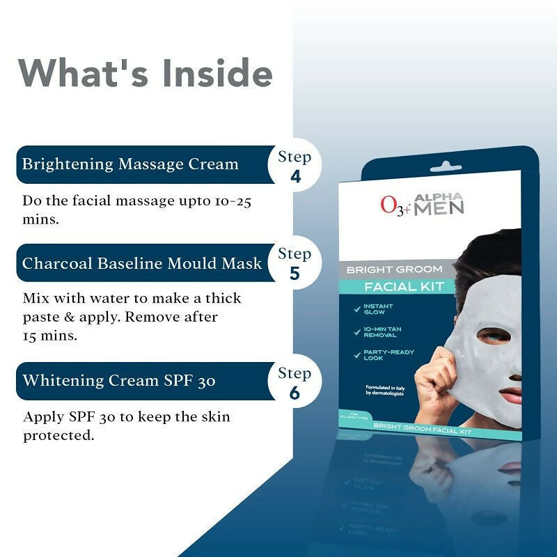 - Prepare yourself for any special event with the O3+ Alpha Men Bright Groom Facial Kit. This is the ultimate facial kit for men aiming for a radiant glow on their big day. It excels in cleansing and revitalizing the skin, enhancing the face's luminosity and brilliance. With this kit, achieving clear and invigorated skin becomes effortless. Enriched with the benefits of Niacinamide acids, it enhances skin texture, balances skin tone, and reduces pore visibility. Sugar Maple Extract tenderly exfoliates, while Activated Charcoal purifies by extracting impurities and thoroughly cleanses pores to minimize their appearance. This Alpha Men Groom Facial Kit is ideal for all skin types.