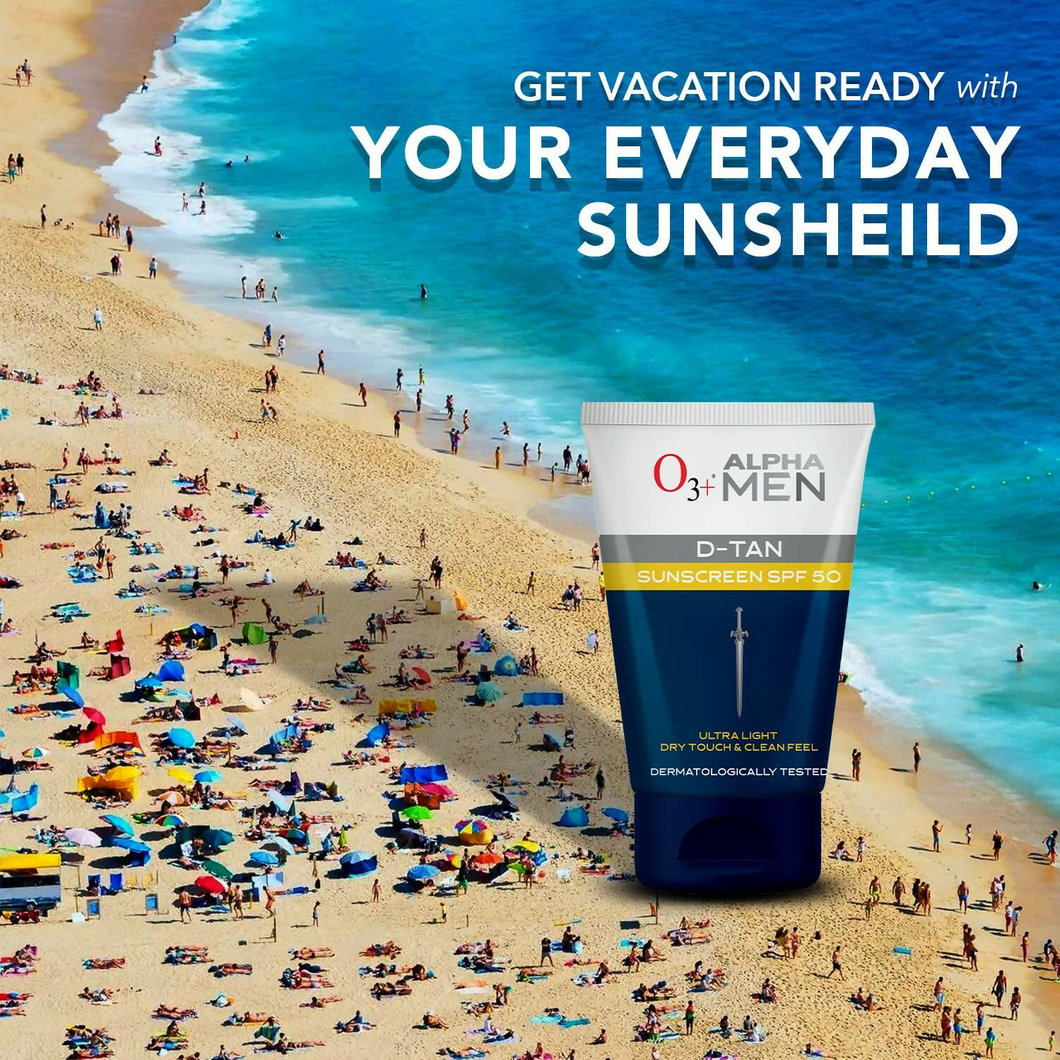 - Get your skin ready with O3+ AlphaMen D-Tan Sunscreen SPF 50. This transparent sunscreen provides superior UVA and UVB defense without leaving a sticky residue. Whether you're heading outdoors or tackling daily activities, applying D-Tan sunscreen preps your skin for any situation. Incorporate this exceptional sunscreen into your daily skincare regimen. Achieving sun protection is a breeze with this D-Tan sunscreen, offering broad-spectrum coverage for up to 8 hours. Featuring SPF 50, it's ultra-light and non-greasy. The formulation includes Hyaluronic Acid, Niacinamide, and Ceramide. Niacinamide combats damage from UV exposure and pollution, Hyaluronic Acid enhances skin elasticity and minimizes wrinkles, while Ceramide ensures moisture retention. Bid farewell to tanning with this D-Tan sunscreen!