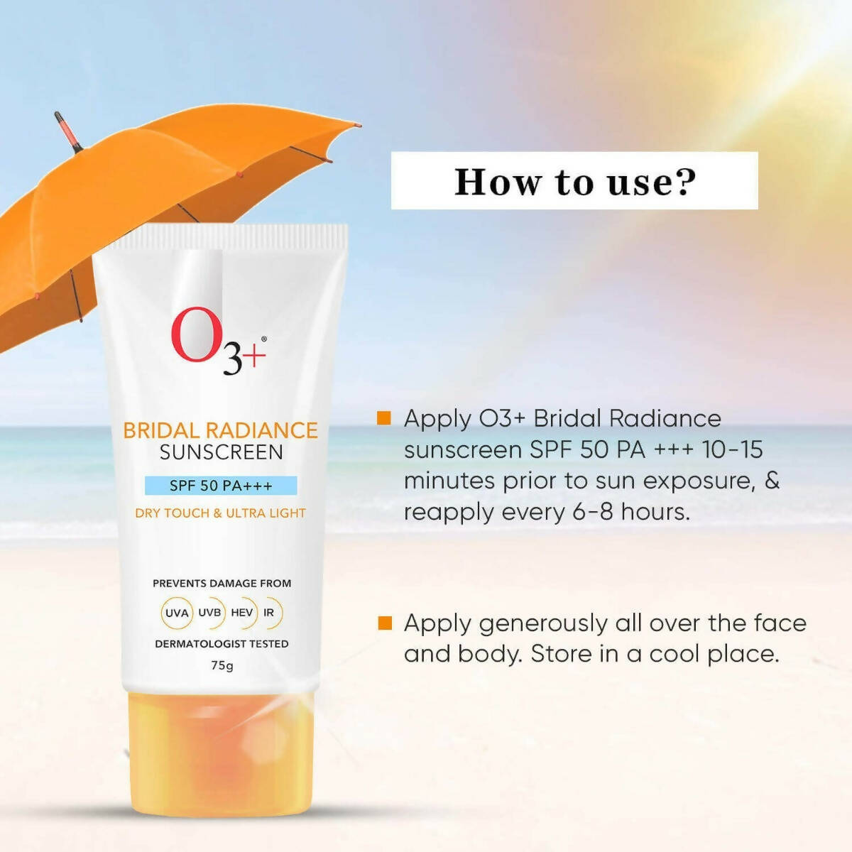 - Shield your skin with O3+ Bridal Radiance sunscreen. This Bridal Radiance SPF 50 PA +++ offers thorough defense against UVA and UVB rays while brightening the complexion and averting sun tan. It’s an exceptionally lightweight and non-greasy sunscreen, ensuring a pleasant application experience. The SPF 50 PA +++ formulation safeguards the skin without leaving a white residue. It imparts a lovely, luminous finish. Enriched with Niacinamide and acai berry, the sunscreen provides additional benefits. Niacinamide aids in reducing tan and enhances skin softness and smoothness. It also helps regulate oil and sebum levels to minimize breakouts. Acai berry, rich in vitamins and minerals, boosts skin vitality, helping to decelerate signs of aging while also lightening scars and preventing acne and breakouts.