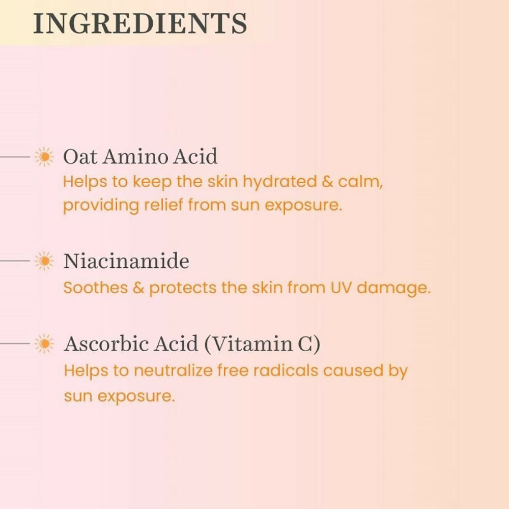 - It offers enhanced protection from UV rays and aging induced by heat. Oat amino acid calms and hydrates your skin, Niacinamide controls oil production, reduces pore size, and enhances collagen, while Ascorbic acid, or vitamin C, combats free radicals, brightens your complexion, and diminishes dark spots.