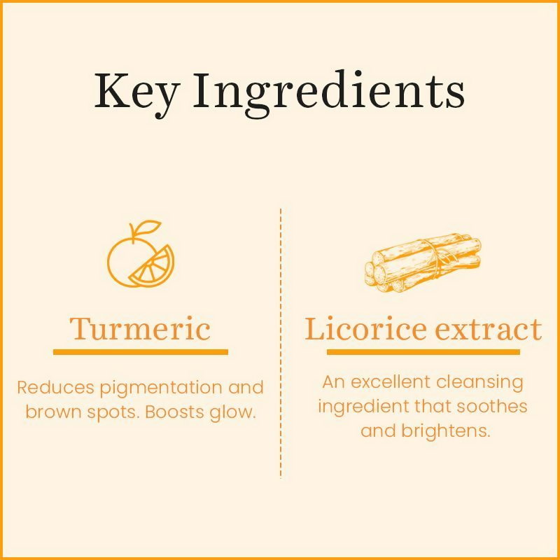 - Infused with the antioxidant power of vitamin C, it supports a clear complexion and preserves skin elasticity. Turmeric, a time-honored herb, revitalizes your skin by revealing its natural glow, while licorice offers a calming effect and helps soothe inflammation. It's the ideal choice for achieving supple, firm, and radiant skin with daily use.