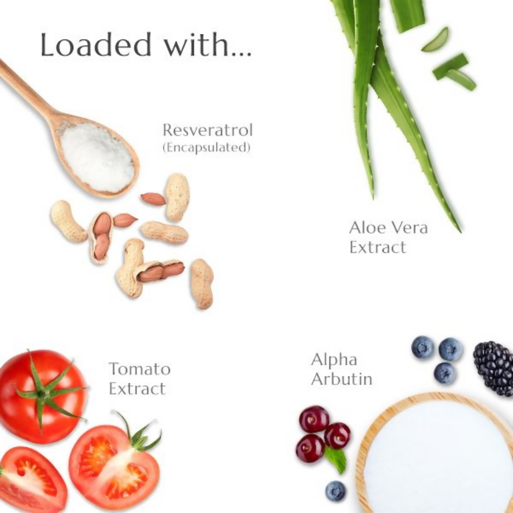- Tomato Extract, Alpha Arbutin, Resveratrol, Aloe Vera Extract