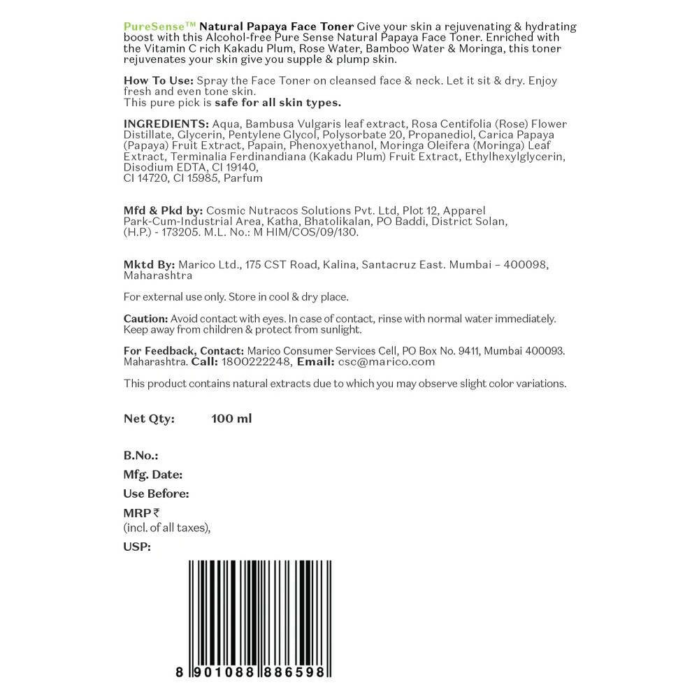 - PureSense Natural Papaya Face Toner enhances the texture of your skin, maintaining a fresh, cool, and hydrated feel. This exceptional choice is free of parabens, sulfates, and carcinogens. Experience clear, moisturized, and revitalized skin with the PureSense Natural Papaya Face Toner.