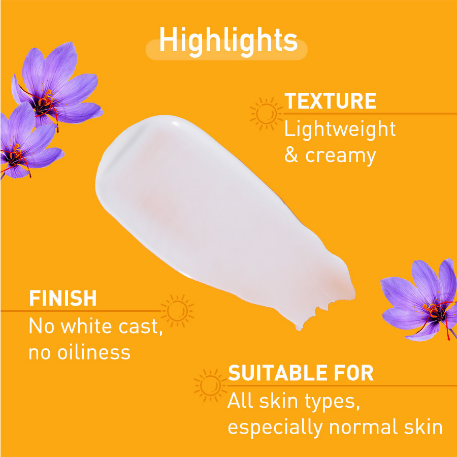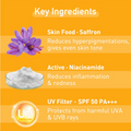 - Experience the exclusive blend of Saffron extracts and Niacinamide, expertly crafted to deliver comprehensive sun protection. The SPF 50 PA+++ formula shields your skin from the detrimental UV A and UV B rays, while the inherent antioxidants in Saffron extracts help prevent skin darkening and impart a radiant glow.