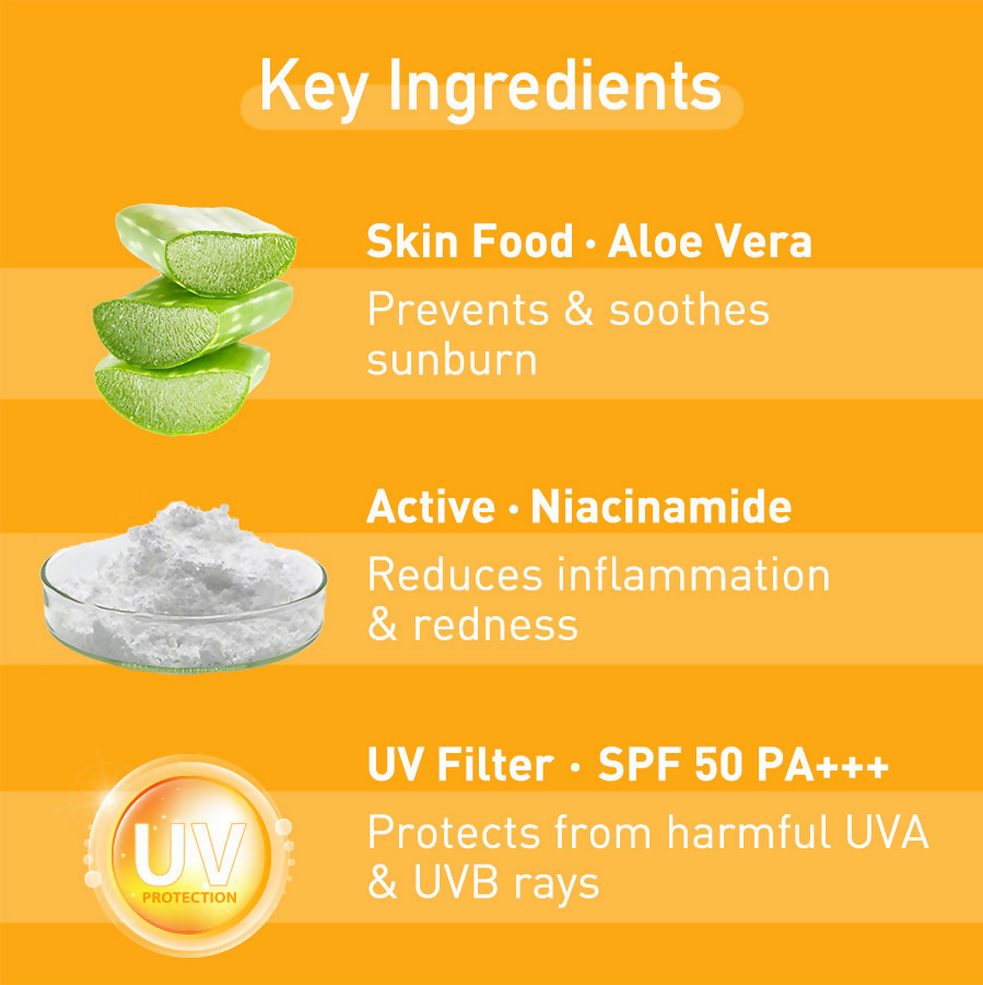 - Our sunscreen gel formulation is enriched with Aloe Vera and Niacinamide extracts, offering protection from detrimental UV A and UV B rays while maintaining your skin's radiance. It is the ideal sunscreen for oily skin as it does not leave a greasy residue, providing you with soft and smooth skin.