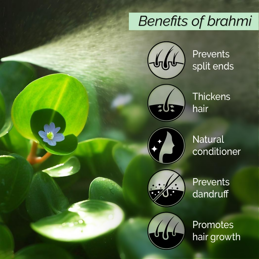 - Brahmi, celebrated for its esteemed roots in Ayurvedic heritage, delivers a wealth of hair advantages, such as boosting hair vitality, curbing hair loss, enhancing scalp health, averting split ends, and offering natural conditioning for fuller and healthier-looking hair.