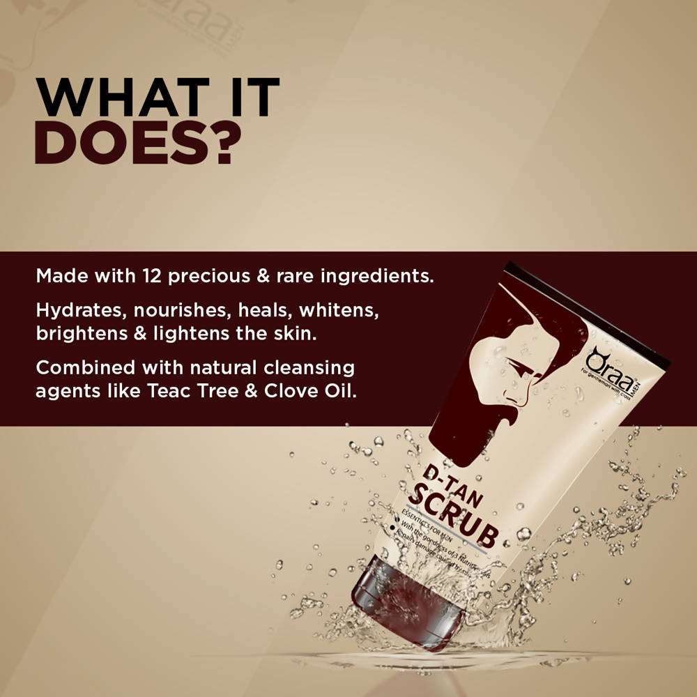 Qraa D Tan Scrub is crafted with 12 rare and valuable ingredients designed to smooth fine lines, enhance skin tone, and encourage new cell development. Our Ayurveda-inspired formula is infused with premium oils that illuminate your skin and reduce pigmentation. Finely milled Sweet Almonds, abundant in Vitamins E & D, nourish and care for your skin while exfoliating pollutants and impurities, resulting in a radiant complexion.This product is free from parabens, harmful chemicals, harsh metals, and synthetic additives that could cause damage.