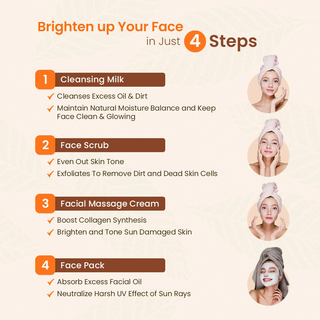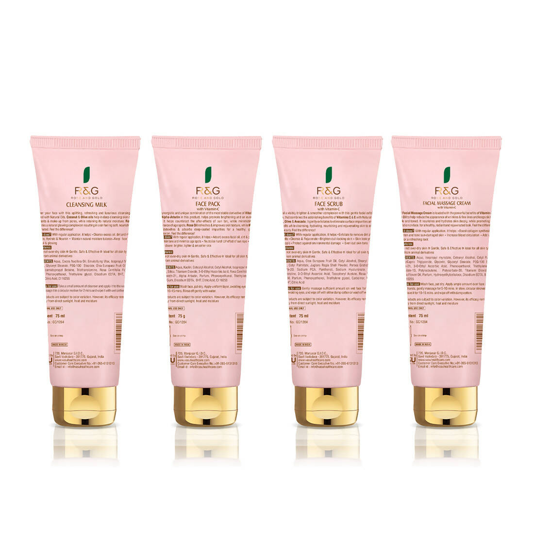 Experience a Gold-Like Radiance with the R&G Skin Brightening Facial Kit for Women. This kit includes Cleansing Milk, Face Scrub, Facial Massaging Cream, and a Face Pack, all designed to give you luminous and vibrant skin in 4 simple steps. Enjoy up to 10 uses per kit for a rejuvenating facial experience.