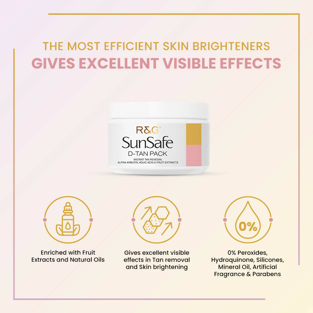 R&G Sun Safe D-Tan Pack offers the efficacy of Natural Oils and Fruit Extracts, including Eucalyptus Oil, Clove Oil, Orange, Lemon, and Sugar Maple extracts, delivering an instant radiant and lightening effect. This sophisticated formula calms, nourishes, and moisturizes the skin, while being free from harmful chemicals.