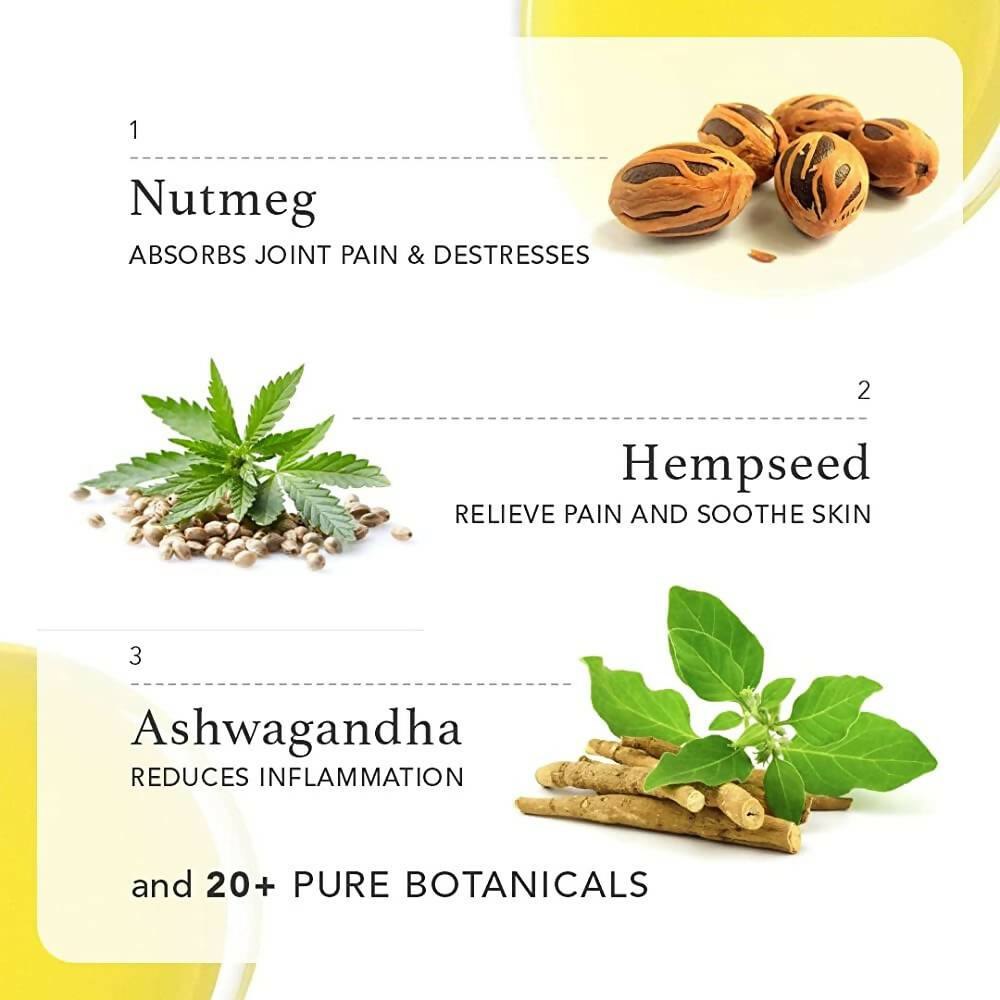 - This soothing oil blend, crafted with organic Sesame and Moringa oils, is enriched with potent extracts such as Ashwagandha, Ginger, Giloy, Turmeric, and essential oils like Nutmeg, Eucalyptus, and Rosemary. It is designed to ease body discomfort, relax muscles, and leave skin feeling nourished and smooth.