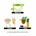 - Infused with green tea, black tea, oatmeal, and jojoba to support skin tone and texture