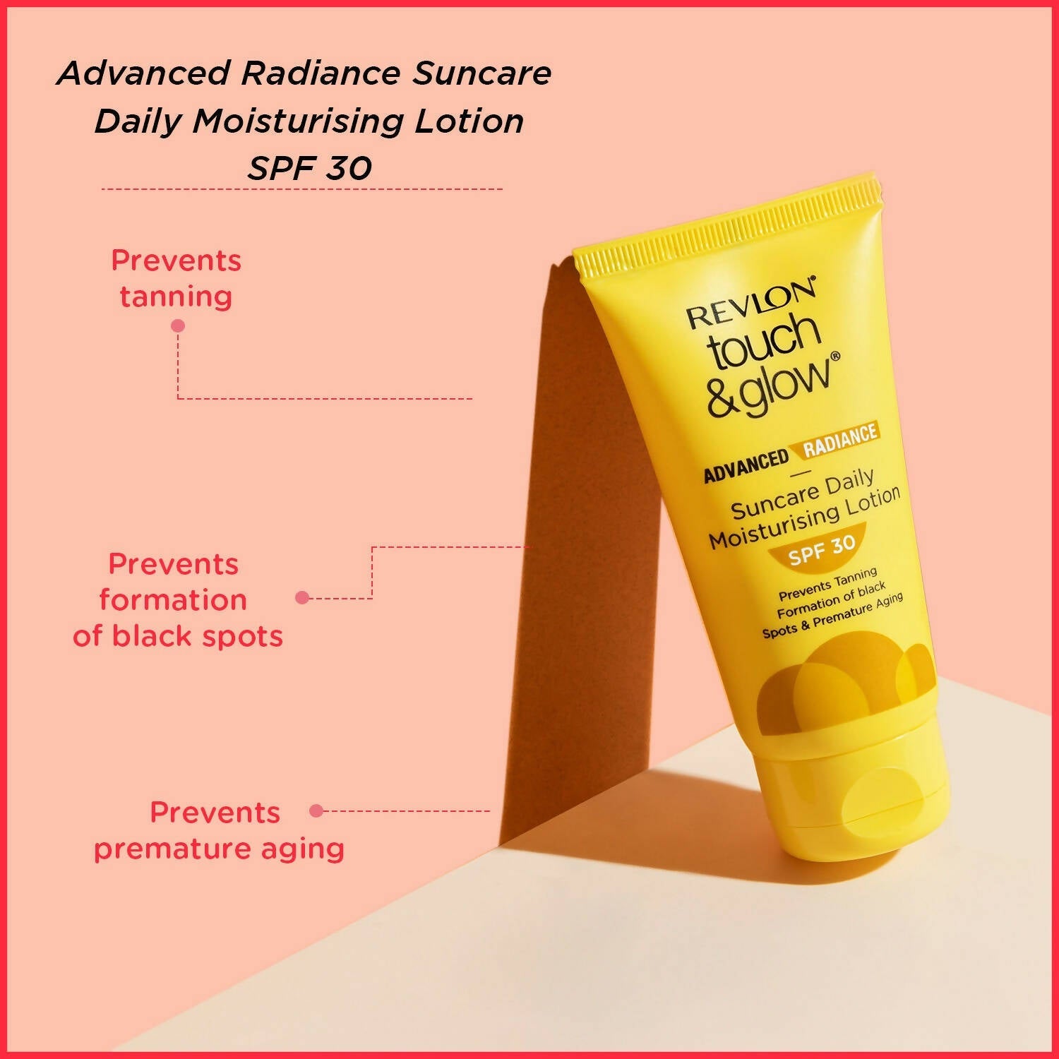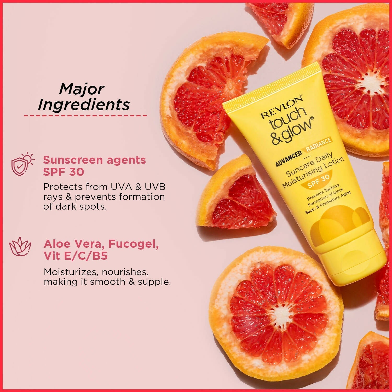 About the Product:- Bid farewell to tanning with Revlon Touch & Glow Advanced Radiance Sun Care Daily Moisturizing Lotion SPF 30. Enriched with aloe vera, fucogel, and vitamins E, C, and B5, this lotion profoundly hydrates the skin, leaving it soft and rejuvenated. It is infused with sunscreen agents and SPF 30, which shield against harmful UVA and UVB rays.