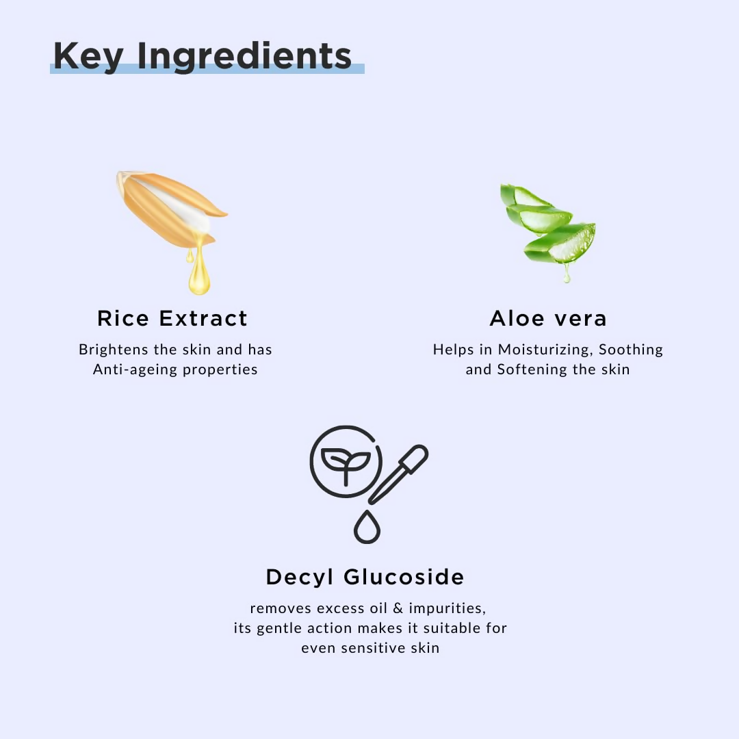 About the product:- Infused with the quintessential ingredient of Korean skincare, rice, this rice water face wash is ideal for achieving soft, radiant, and youthful-looking skin.