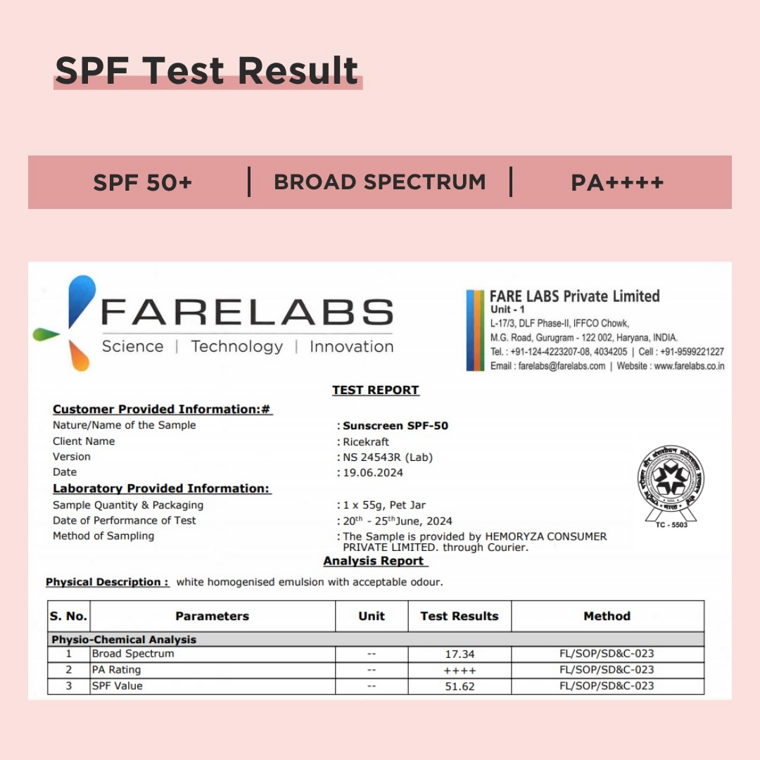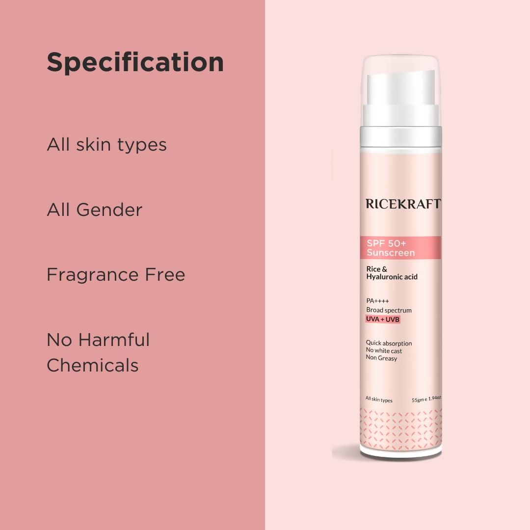 - Infused with the nourishing benefits of Rice, Hyaluronic Acid, and Vitamin E, this SPF 50+ Sunscreen provides comprehensive protection against sun damage while delivering that sought-after K-beauty radiance.