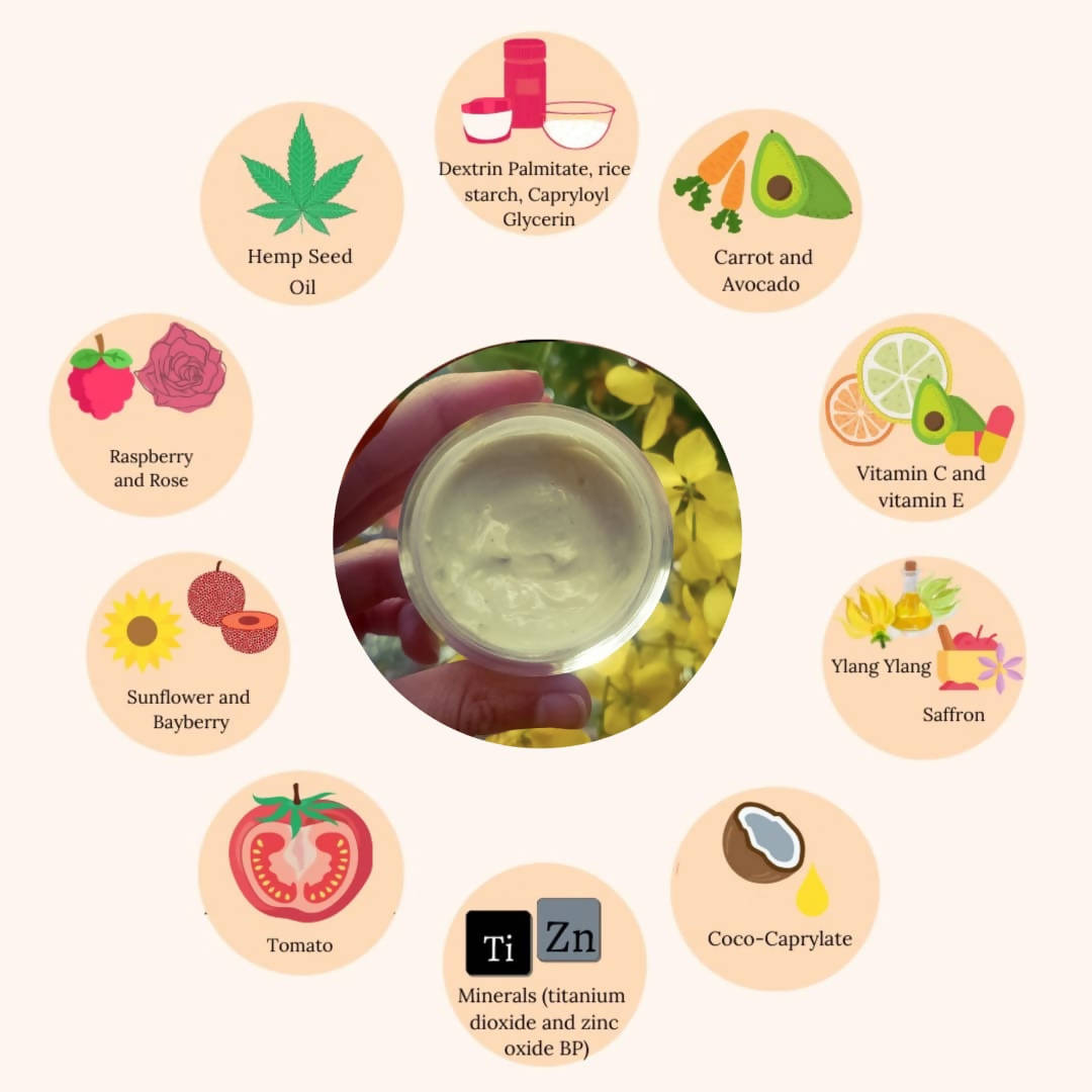 Ingredients: Coco-Caprylate / Caprate, Zinc Oxide BP, Helianthus annuus (Sunflower) Seed Wax, Myrica cerifera (Bayberry) Fruit Wax, Rubus idaeus (Raspberry) Seed Oil, Persea gratissima (Avocado) Oil, Solanum lycopersicum (Tomato), Titanium Dioxide, Capryloyl Glycerin/Sebacic Acid Copolymer, Pongamia glabra (Karanja) Seed Oil, Mixed Tocopherol (Vitamin E), Cananga odorata (Ylang Ylang) Flower Oil, Rosa damascena Flower Oil, Dextrin Palmitate, Ascorbyl Tetraisopalmitate (Vitamin C), Crocus sativus (Saffron) Flower Extract.
