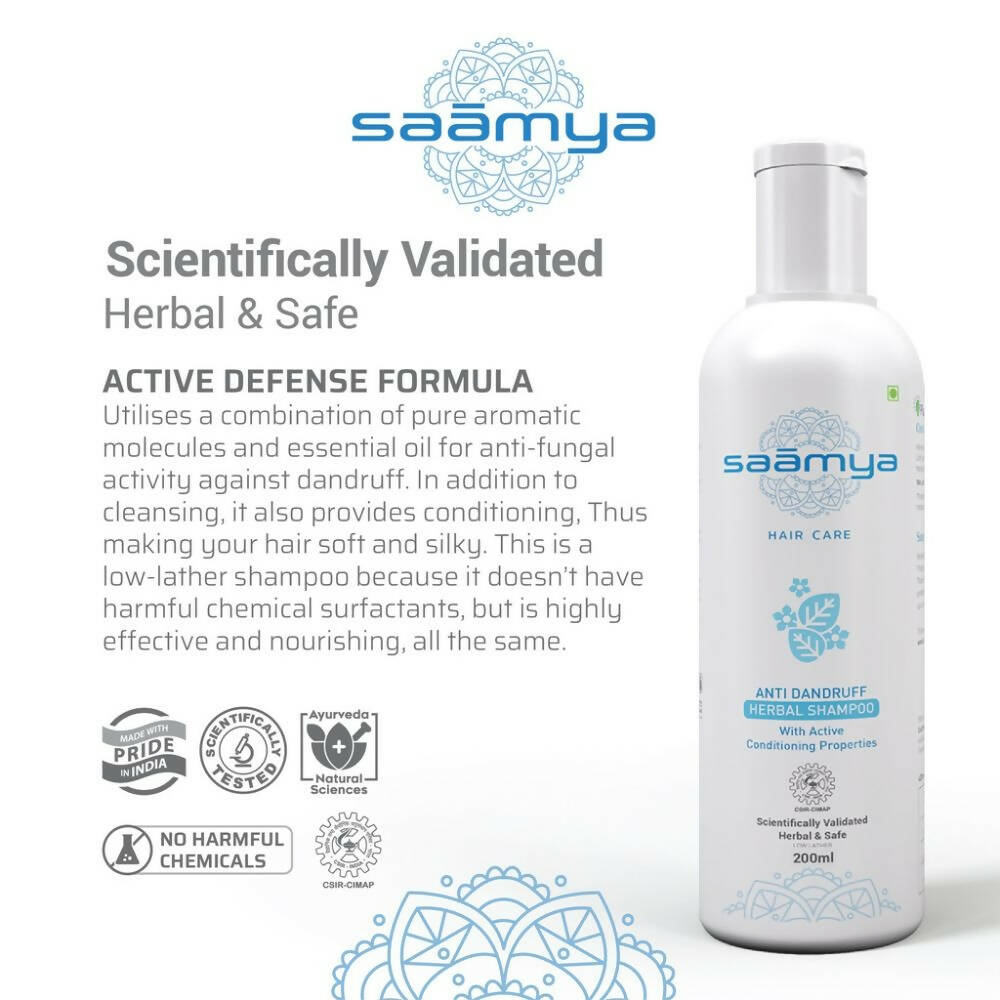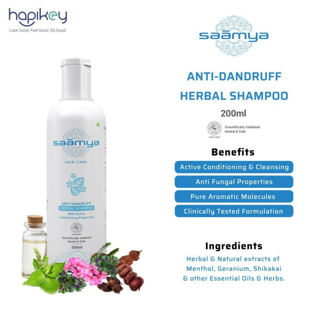 - Saamya Anti-dandruff Herbal Shampoo is crafted with an exceptional blend of herbal, natural, and ayurvedic ingredients derived from traditional plants and essential oils. It harnesses the power of pure aromatic compounds and essential oils like geranium and menthol for their antifungal properties to combat dandruff, ensuring reliable and exceptional results.