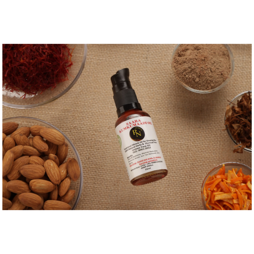 - Saara Kumkumaadi Oil is a time-honored herbal elixir celebrated for its powerful amalgamation of natural components, chiefly sourced from saffron (kumkuma). This exquisite oil is enriched with a blend of herbs and oils that enhance skin vitality and a glowing complexion. Its opulent, golden tint and aromatic essence make it a valuable addition to skincare rituals.
