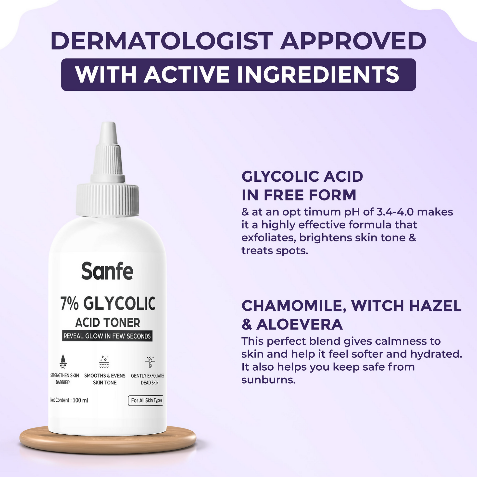 About the product:The Sanfe 7% Glycolic Acid Toner is an effective yet mild exfoliant designed to unveil radiant skin in merely 30 seconds.
