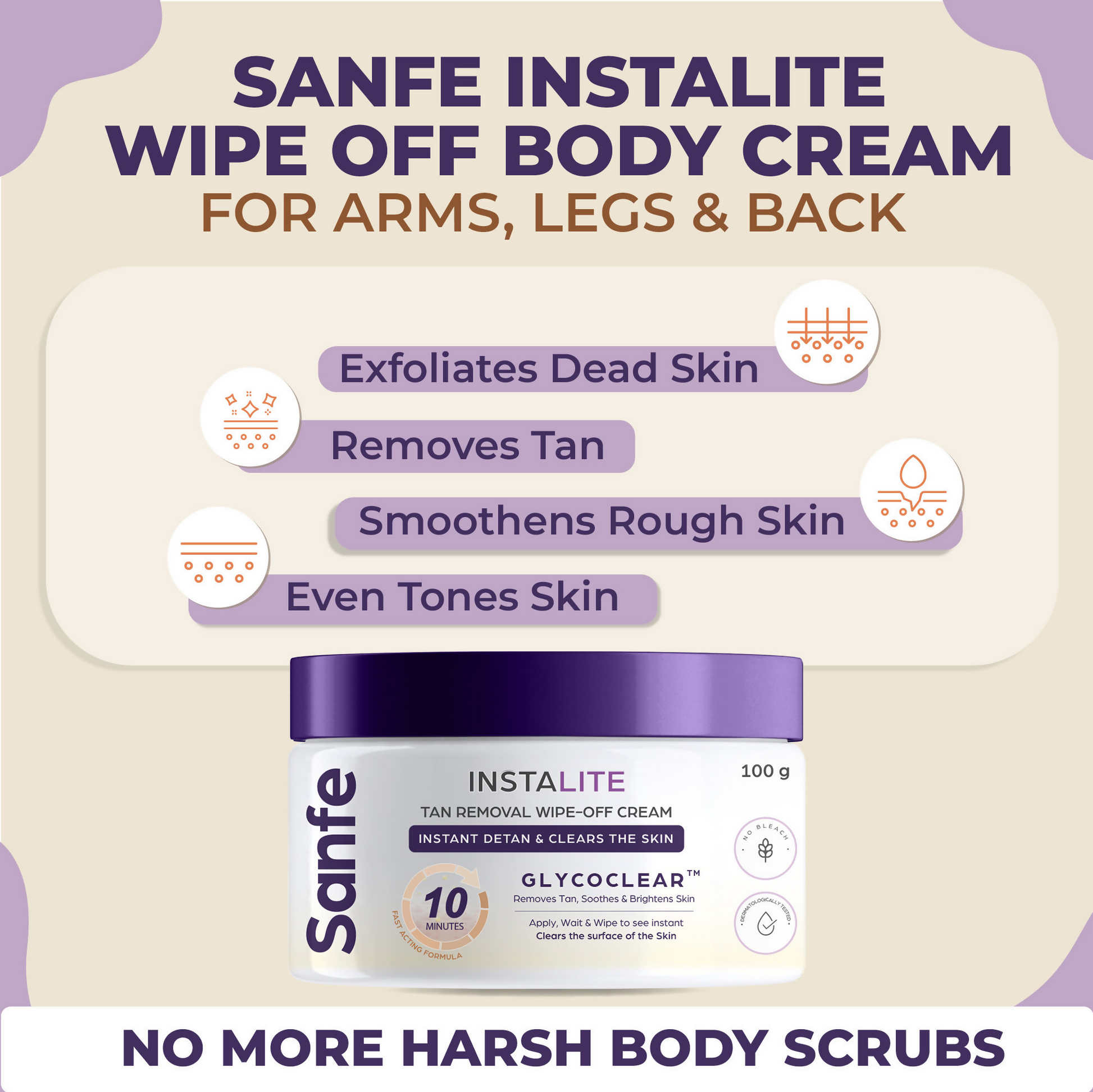 SOLUTION FOR TANNED ARMS, LEGS and BACK: Sanfe Instalite Wipe Off Body Cream features a distinctive formula designed to brighten skin by one tone in just 10 minutes and effectively remove tan with consistent use. Embrace summer confidently as we tackle tanning issues for you. Body Mask for Radiant Skin