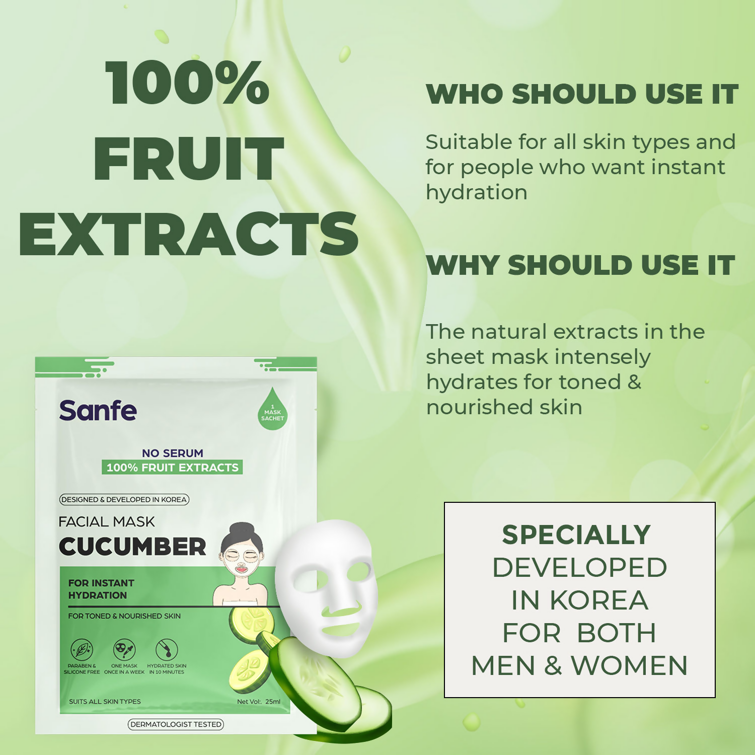 Hydrate your skin with our cucumber sheet mask. Packed with soothing cucumber extract, this mask instantly cools and hydrates tired, dull complexions. Vitamin-rich ingredients like aloe vera and green tea extract nourish while reducing redness and inflammation. Gentle enough for daily use. Skin looks hydrated after 10 minutes. Visibly radiant skin in just a week.
